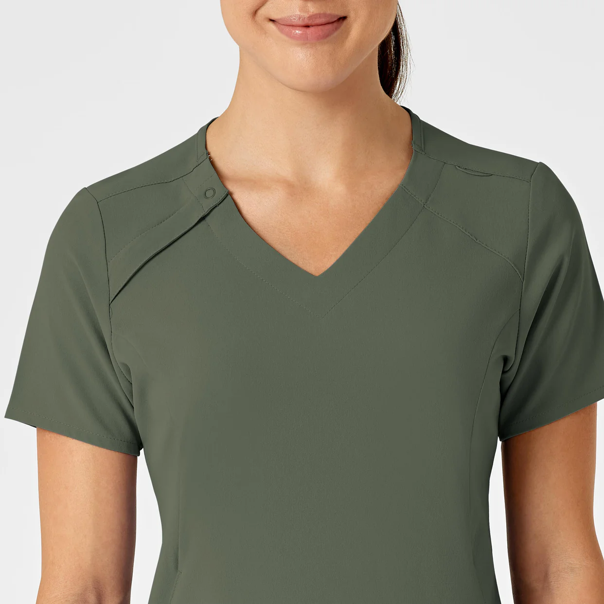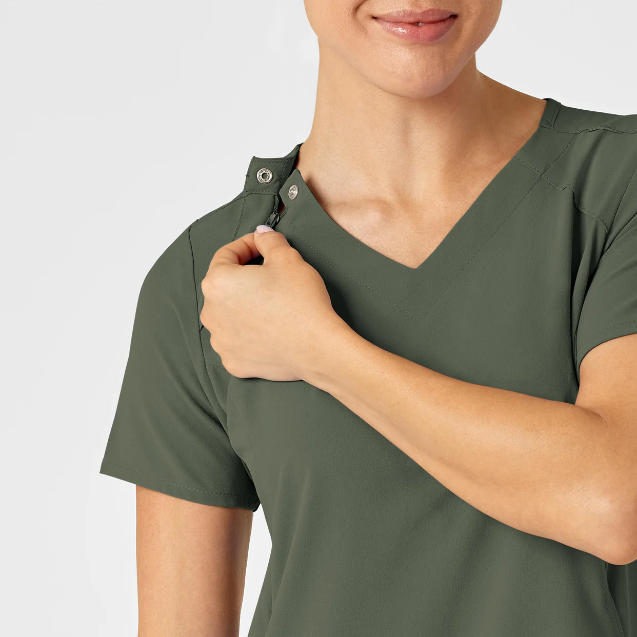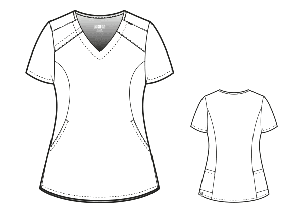 - Dekolt w kształcie litery „V” z krótkim zameczkiem i napami po prawej stronie – szybkie zakładanie i ściąganie.