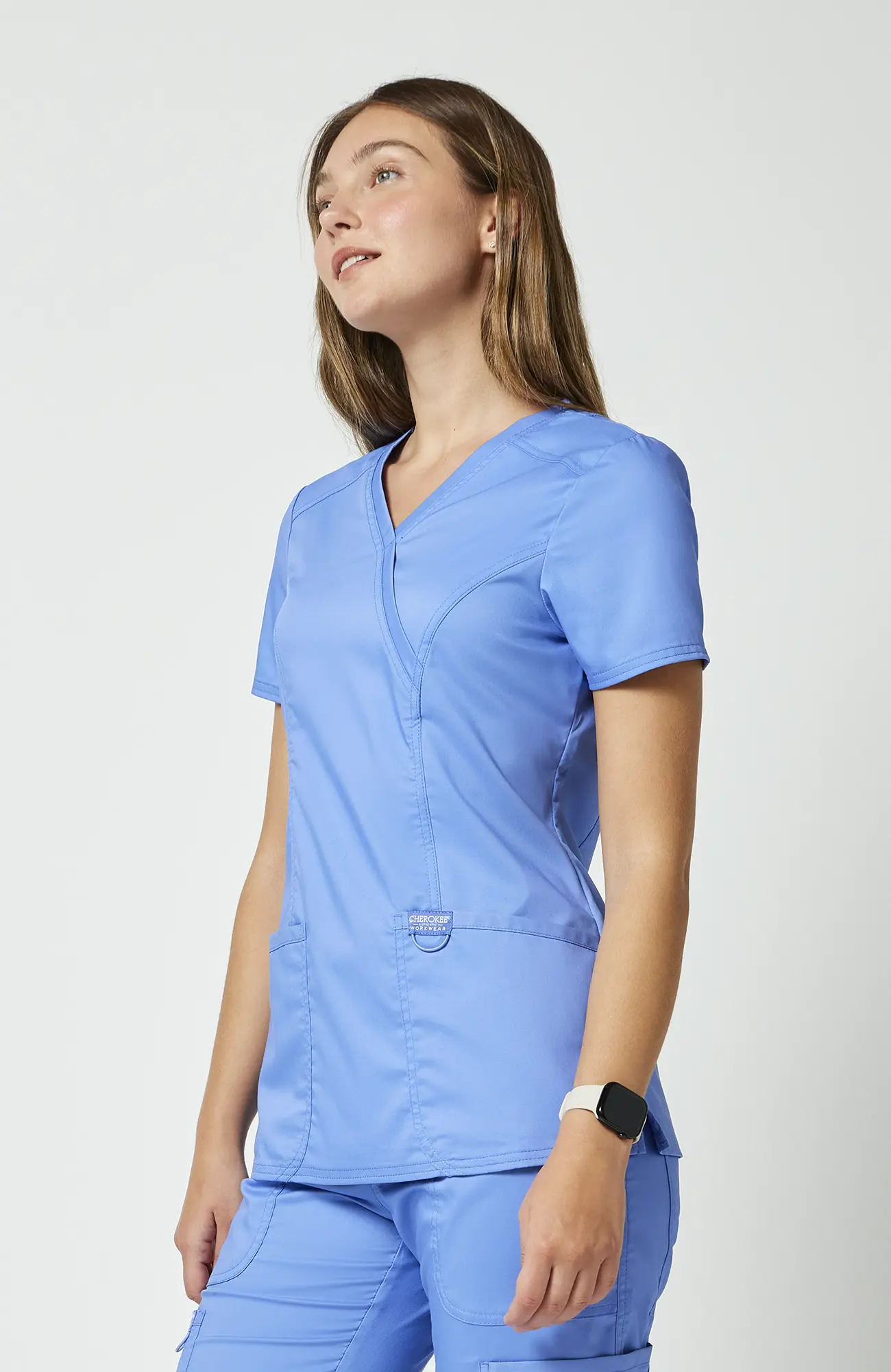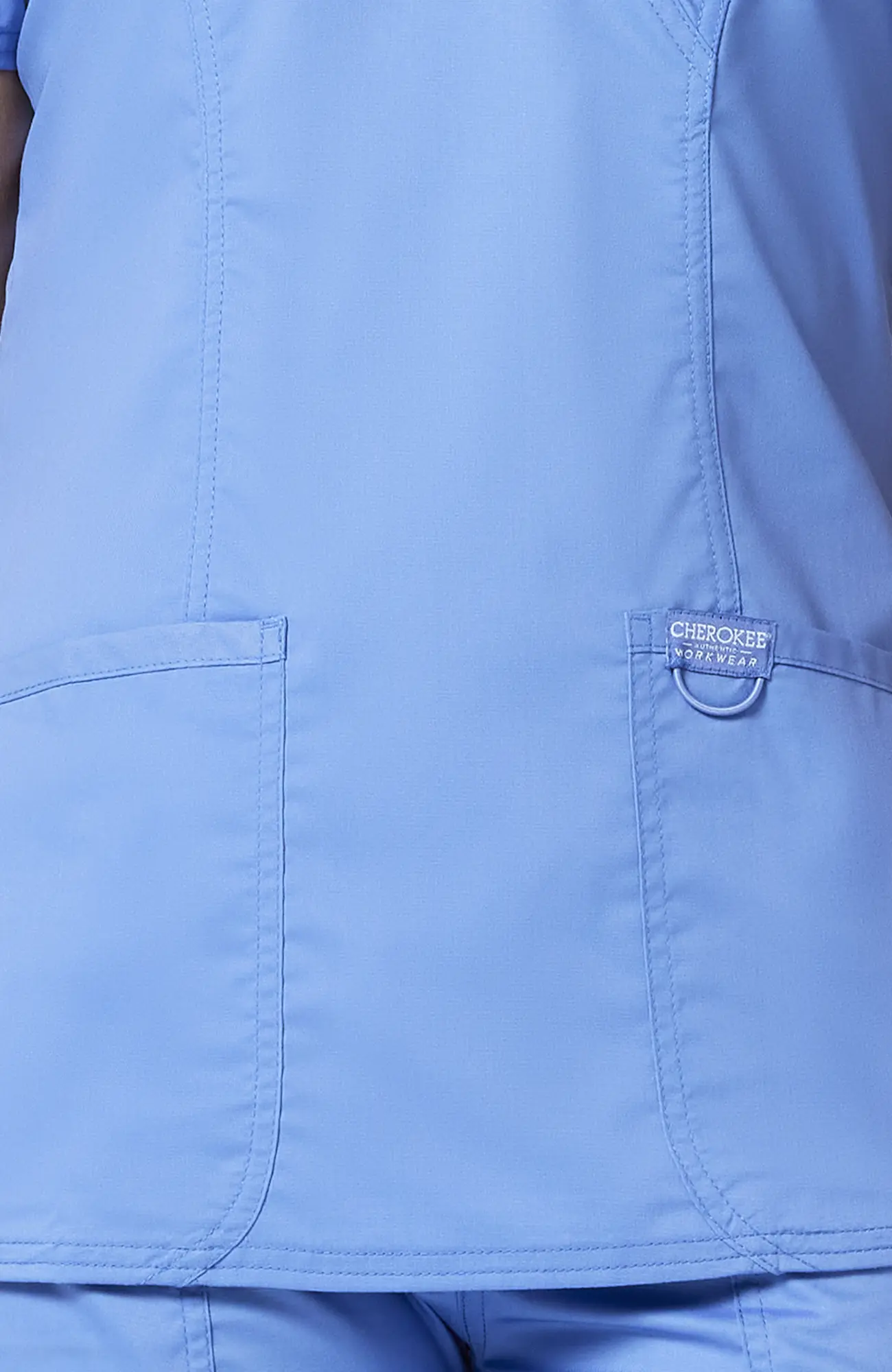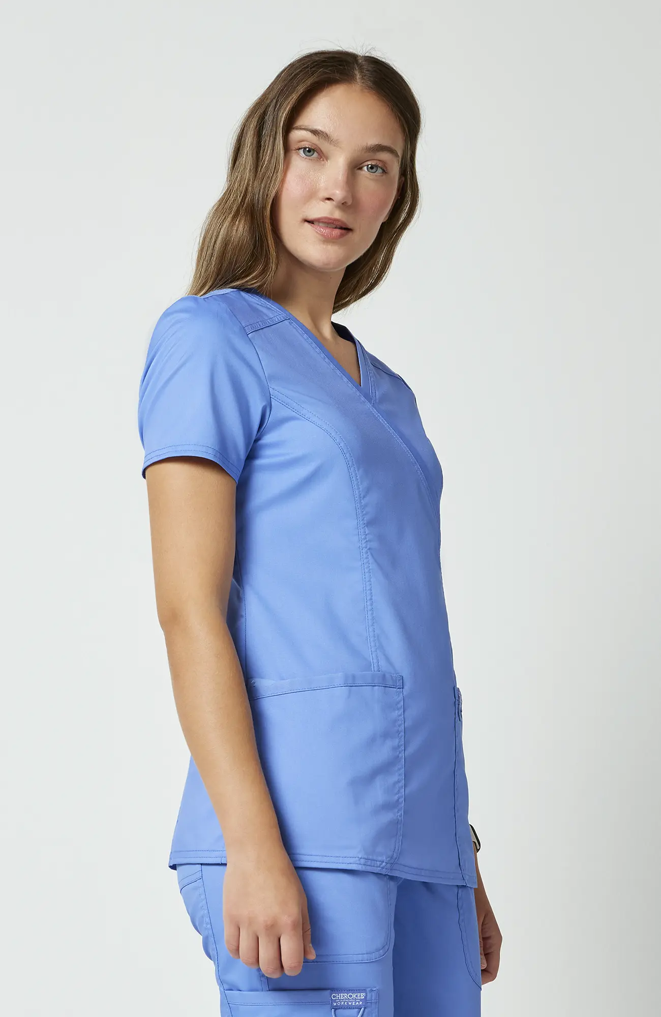 Cherokee Workwear Revolution WWE610_CEIL to damska bluza medyczna w kolorze błękitu gołębiego (ceil blue), który łączy jasność z delikatnym, stonowanym charakterem. Jest to odcień bardziej subtelny niż turkus, a jednocześnie bardziej wyrazisty niż klasyczna biel, dlatego dobrze sprawdza się w środowisku medycznym.