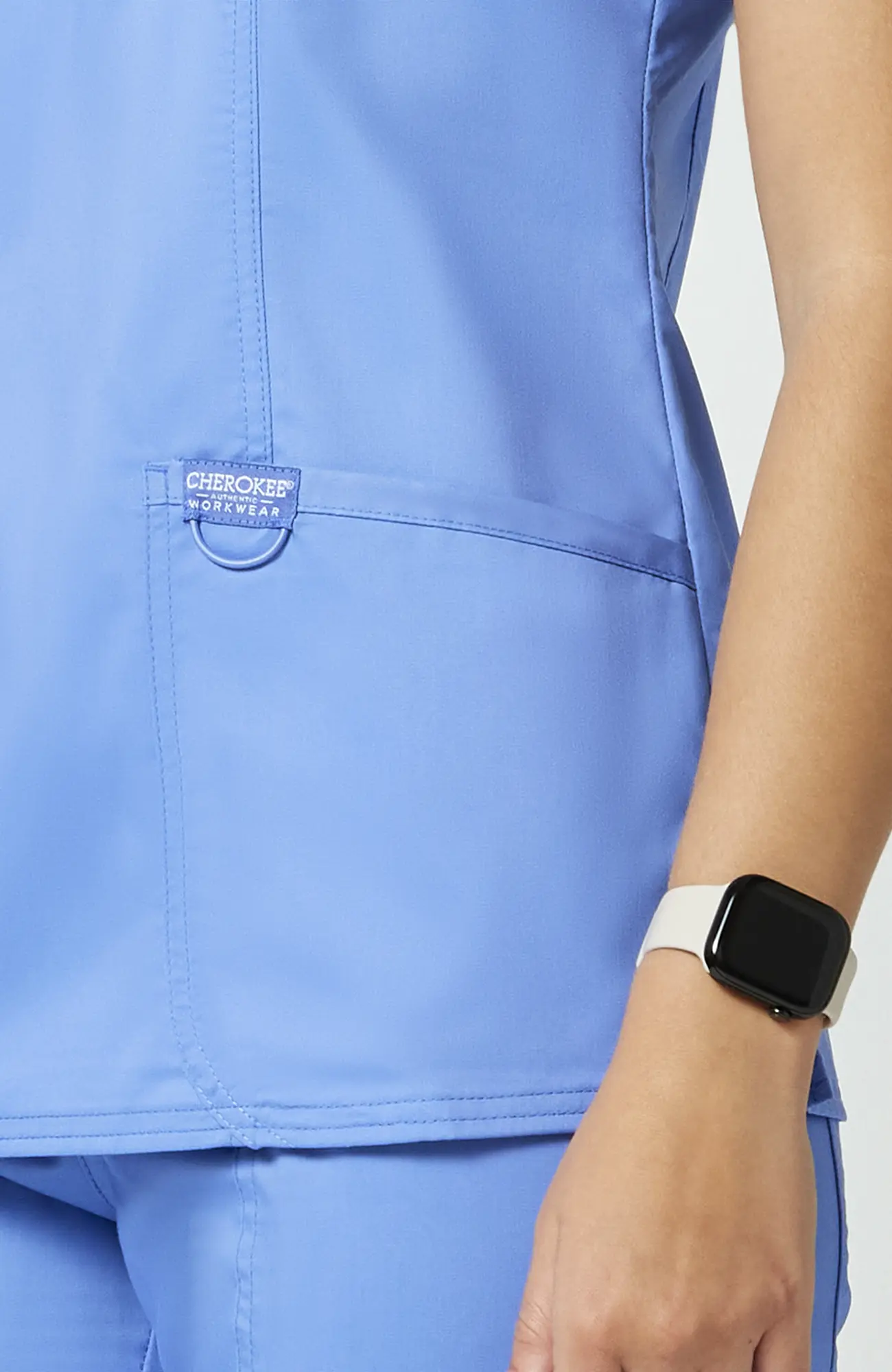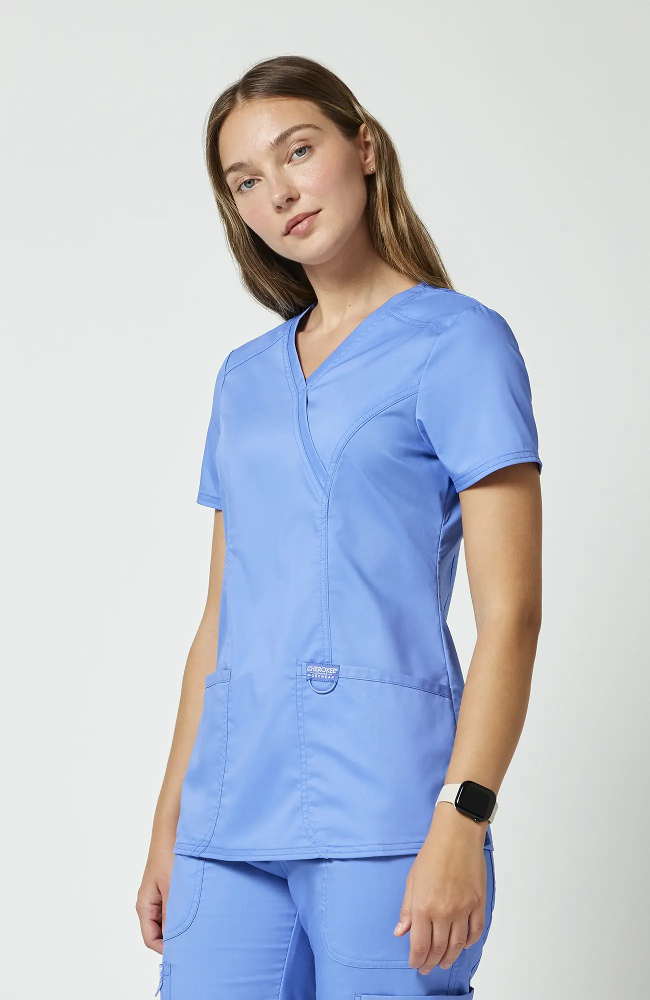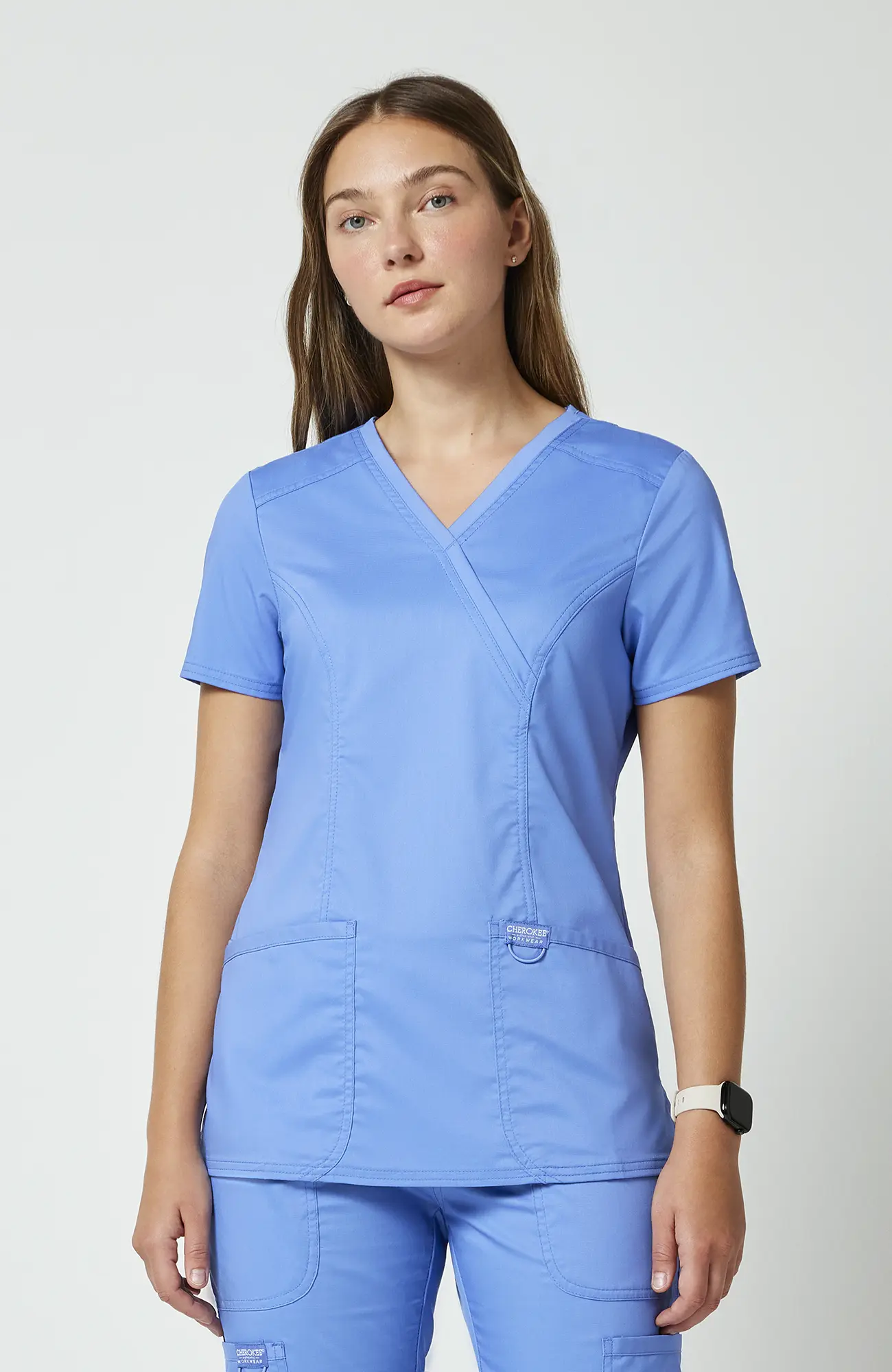 Cherokee Workwear Revolution WWE610_CEIL to damska bluza medyczna w kolorze błękitu gołębiego (ceil blue), który łączy jasność z delikatnym, stonowanym charakterem. Jest to odcień bardziej subtelny niż turkus, a jednocześnie bardziej wyrazisty niż klasyczna biel, dlatego dobrze sprawdza się w środowisku medycznym.