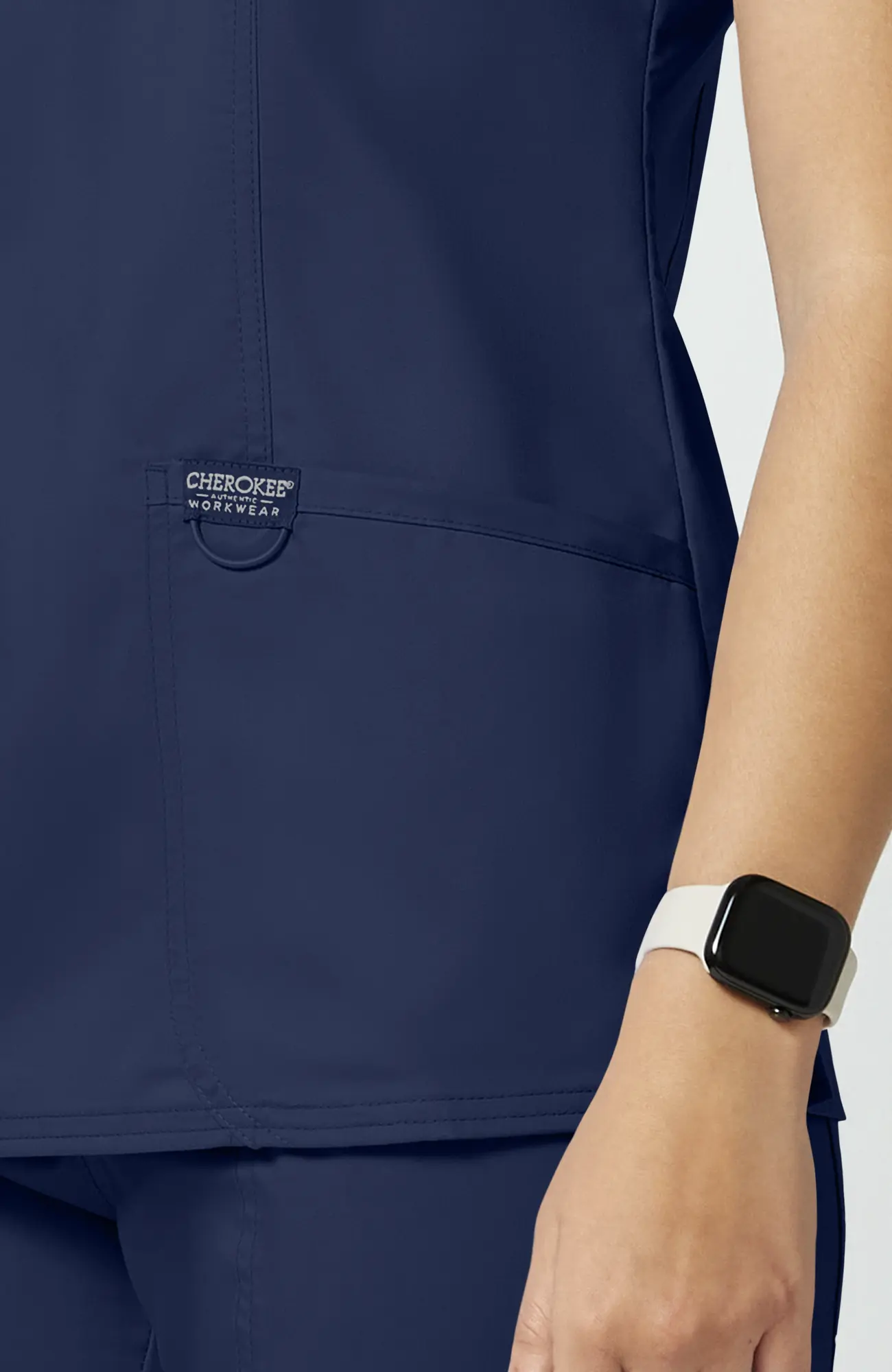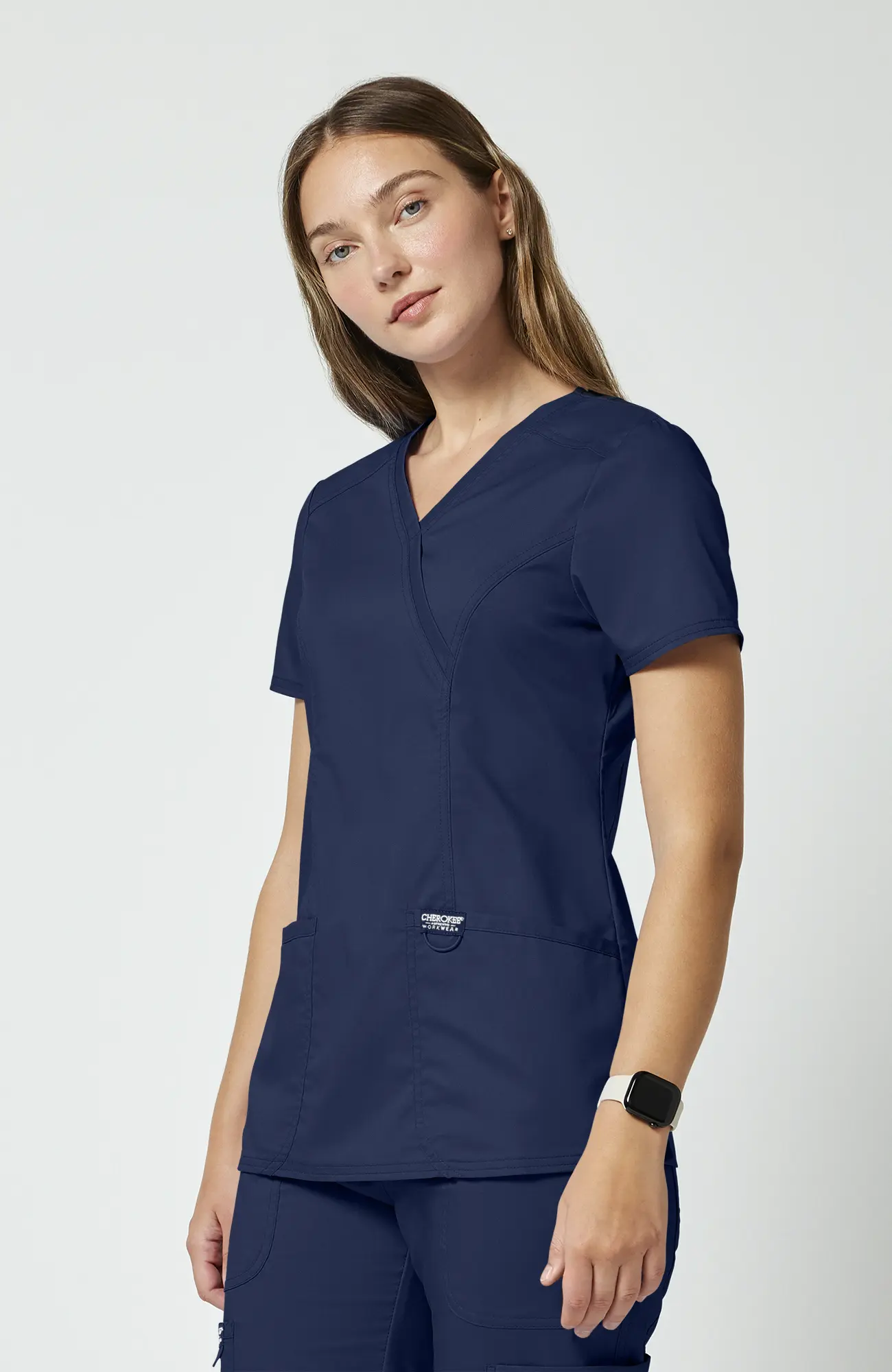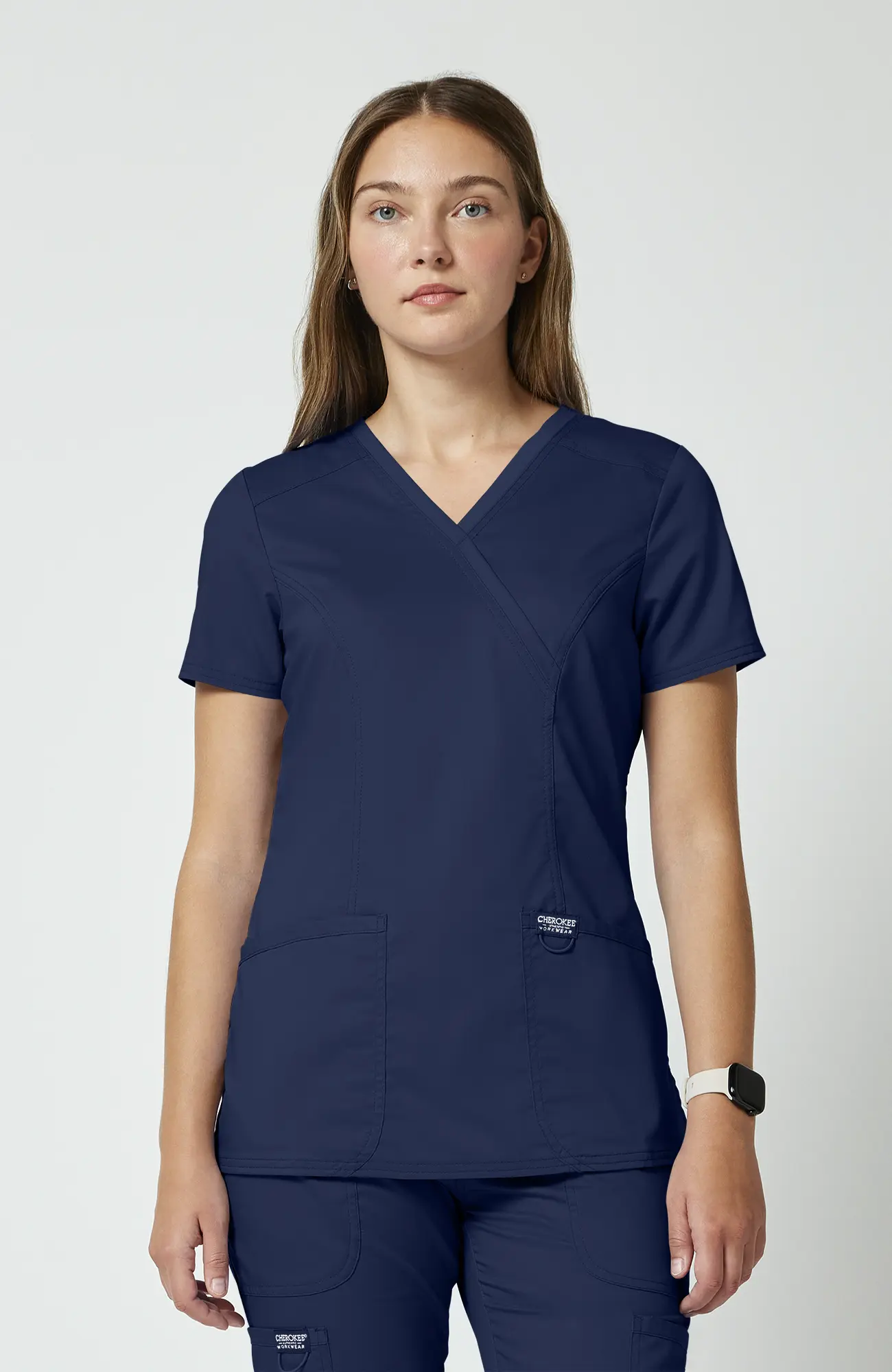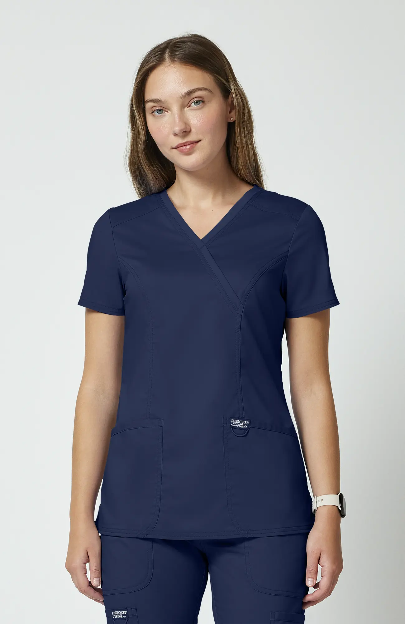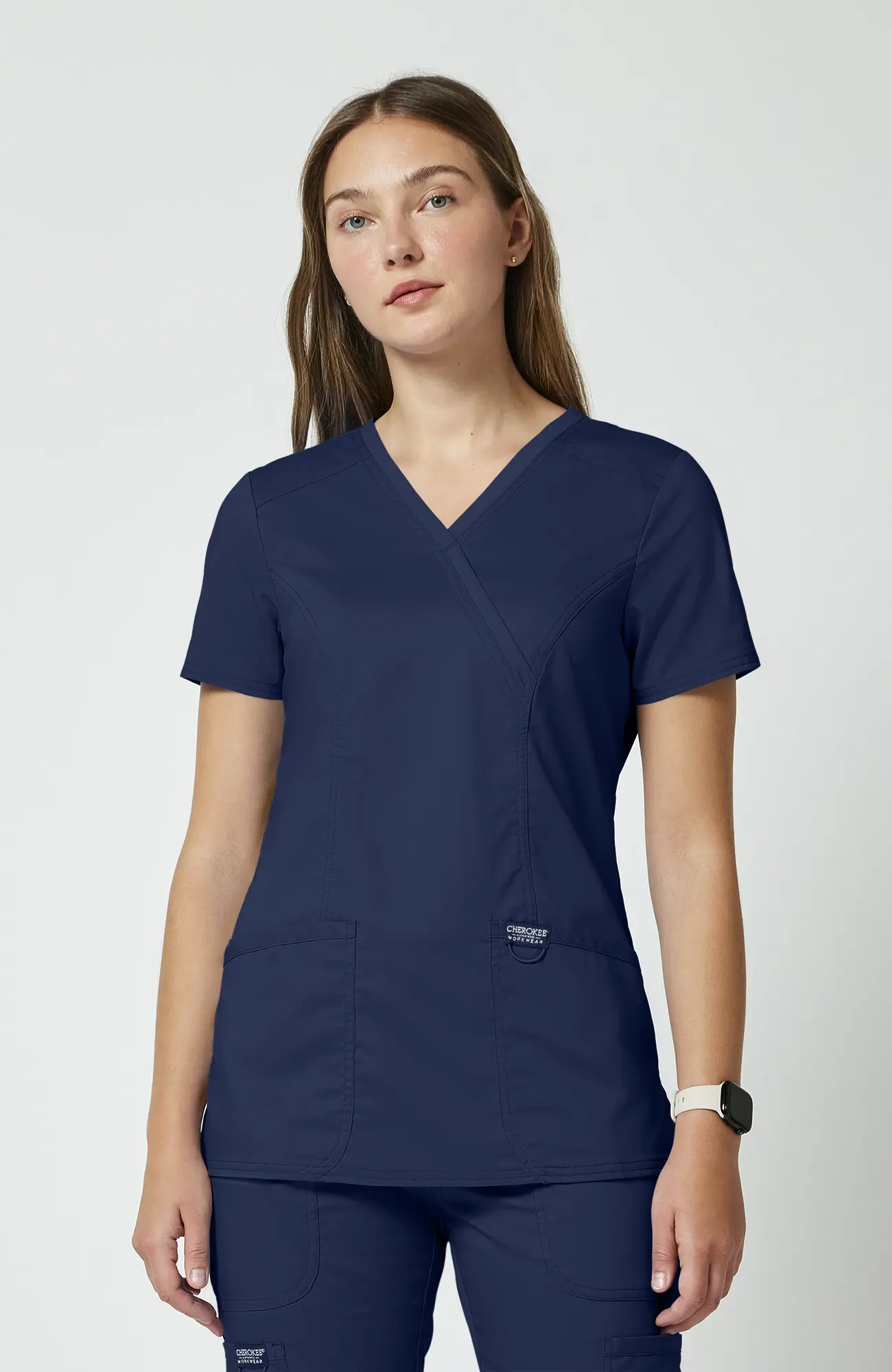 Cherokee Workwear Revolution WWE610_NAVY to damska bluza medyczna w kolorze granatowym, który od lat jest jednym z najczęściej wybieranych odcieni w środowisku medycznym. To kolor bezpieczny, uporządkowany i uniwersalny, dlatego dobrze sprawdza się zarówno w pracy indywidualnej, jak i w zespołach, gdzie ważna jest spójność wyglądu.