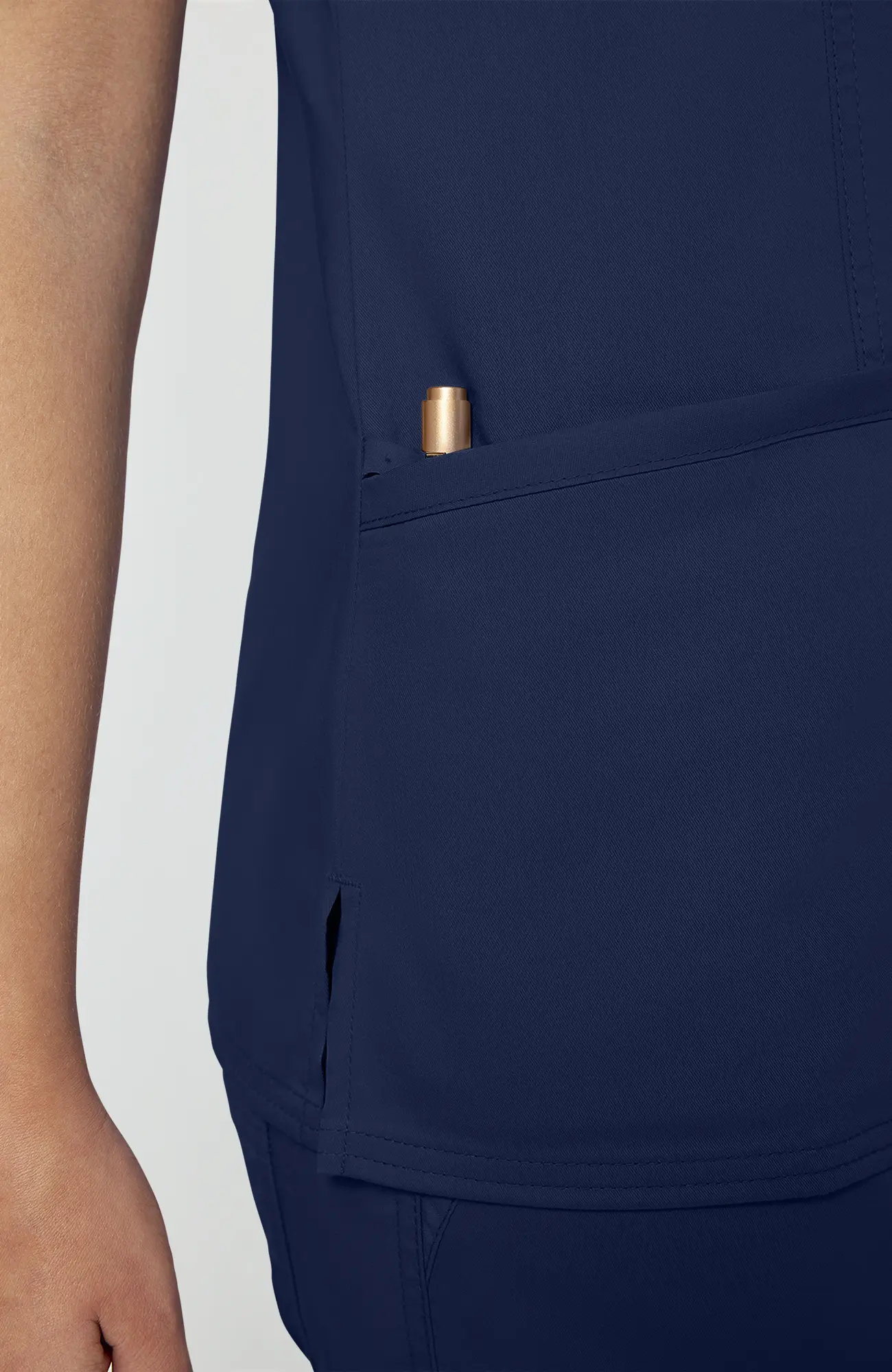 Kopertowy dekolt nadaje bluzie bardziej kobiecy charakter niż klasyczny prosty fason, jednocześnie zachowując profesjonalny wygląd. To rozwiązanie, które dobrze sprawdza się zarówno w pracy z pacjentem, jak i w codziennym użytkowaniu.