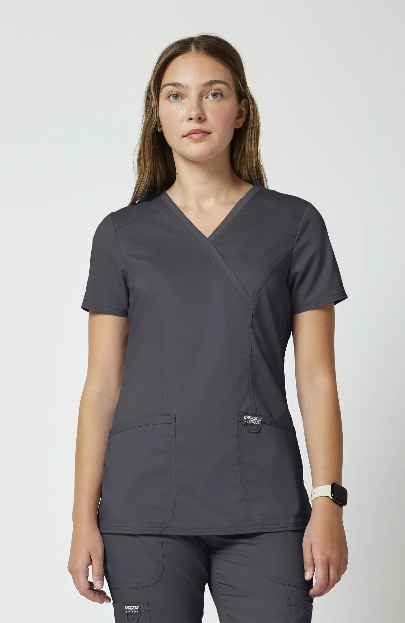 Cherokee Workwear Revolution WWE610_PEWT to damska bluza medyczna w klasycznym szarym kolorze, który dobrze sprawdza się w intensywnym środowisku pracy. To odcień neutralny, praktyczny i mało wymagający wizualnie, dlatego często wybierany jest przez osoby, które stawiają na funkcjonalność i wygodę, a nie na efekt kolorystyczny.