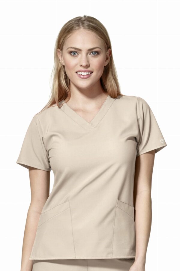 Jednokolorowa bluza medyczna damska W123 6255, uszyta z mikrofibry ze stretchem, to model stworzony z myślą o jak największym komforcie personelu medycznego. Przemyślane funkcjonalności i dodatki sprawiają, że jednokolorowa bluza medyczna damska będzie idealnie sprawdzać się podczas pracy. Bluza medyczna w kolorze piaskowym jest delikatnie taliowana.