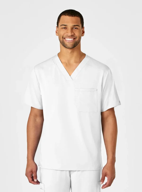 Męska bluza medyczna PRO z dekoltem w kształcie litery V zapewnia estetyczny wygląd oraz komfort podczas pracy personelu w szpitalach czy innych placówkach medycznych. W składzie materiału znajduje się poliester, a także naturalna tkanina którą jest sztuczny jedwab. Jest on bardzo przyjemny i delikatny dla ciała, dzięki niemu bluza jest przewiewna i nie jest sztuczna. Spandex idealnie dopasowuje bluzę do każdej sylwetki. Takie połączenie gwarantuje wysoki komfort dla skóry, nawet bardzo delikatnej. Jednokolorowa bluza medyczna męska szybko schnie po praniu i zachowuje swój intensywny kolor. Dzięki temu będzie zdawać egzamin przez wiele długich lat. Jednokolorowa męska bluza medyczna PRO z pojemną kieszenią na lewej piersi jest niezwykle funkcjonalna. Z łatwością można schować w niej przybory do pracy, żeby mieć je zawsze przy sobie. Jednokolorowa bluza medyczna męska jest także atrakcyjna wizualnie. Wpływa na to zarówno podwójne przeszycie na ramionach, jak i estetyczny dekolt w kształcie litery V.