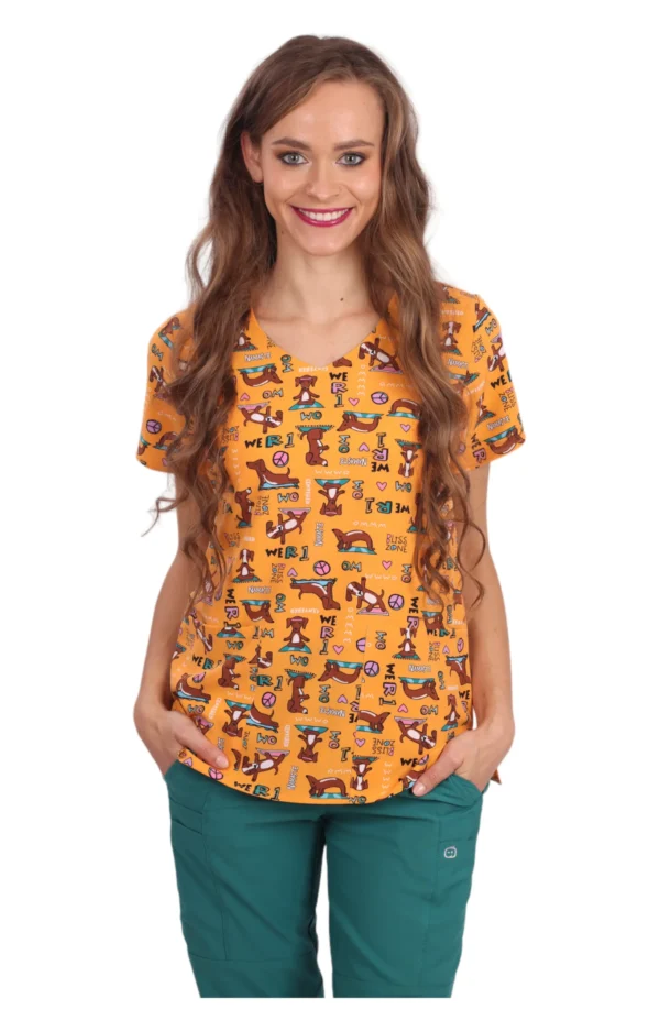 Bluza medyczna damska scrubs — Nady „psia joga” (pomarańczowa, Soft Stretch)